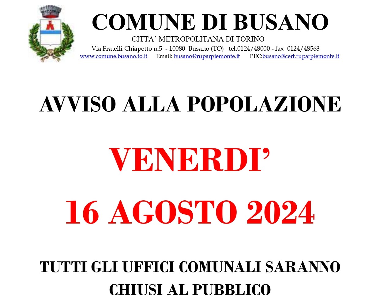 Venerdi’ 16 agosto 2024 tutti gli uffici comunali saranno chiusi al pubblico.