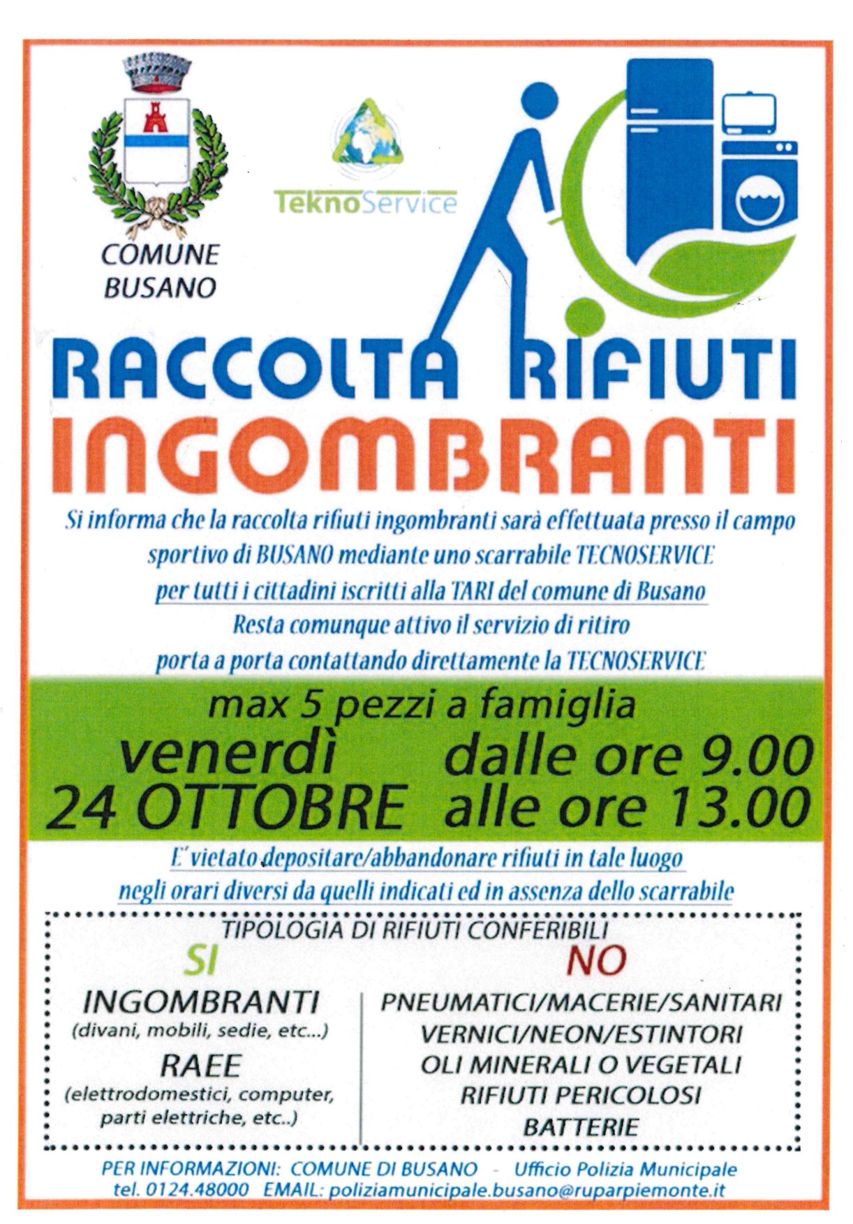 Si informa la popolazione che venerdì 24 ottobre 2025 dalle ore 9.00 alle ore 13.00 sarà effettuata la raccolta rifiuti ingombranti presso il CAMPO SPORTIVO di BUSANO mediante uno scarrabile TEKNOSERVICE per tutti i cittadini iscritti alla TARI del Comune di Busano.