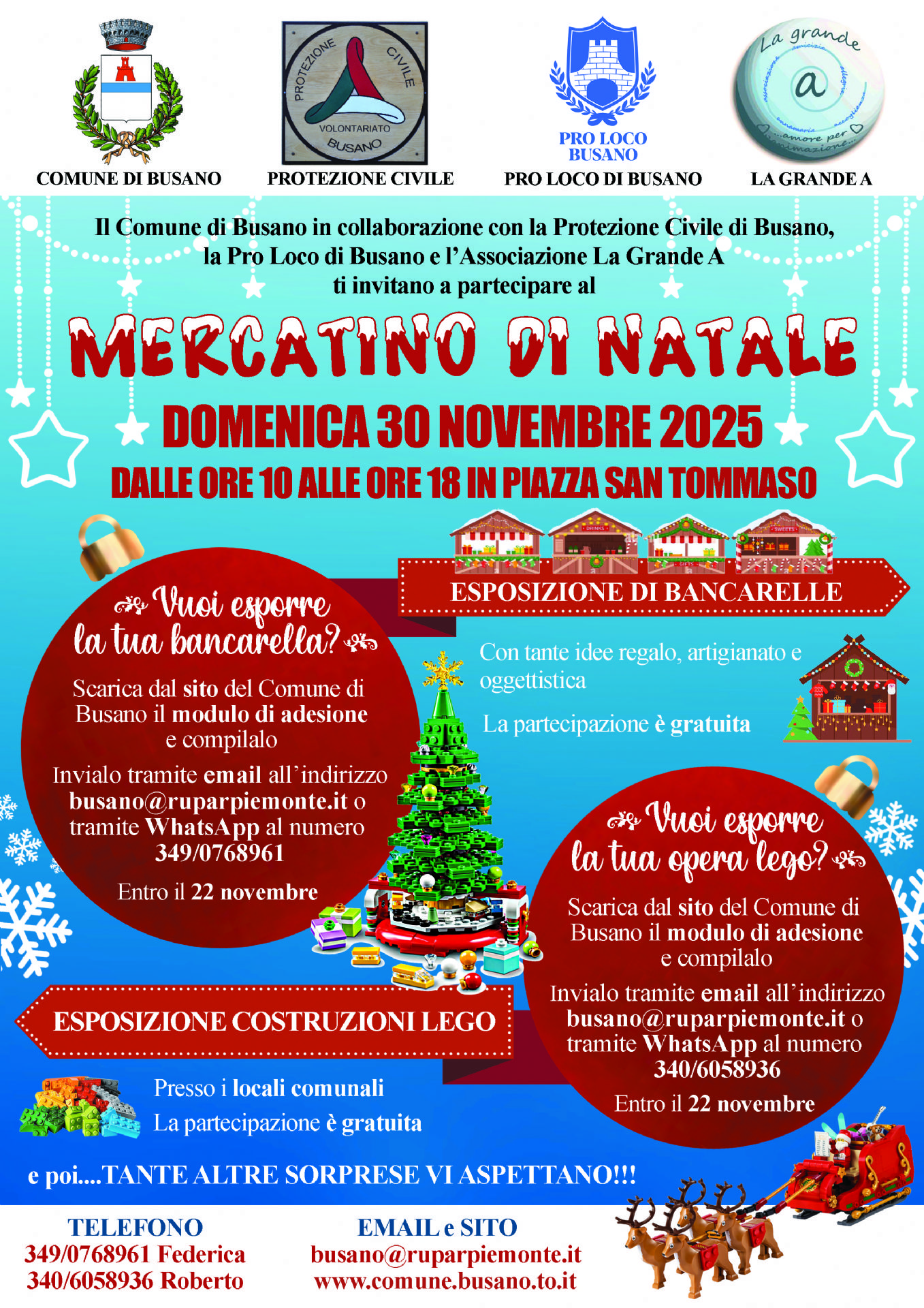 L'Amministrazione Comunale di Busano, in collaborazione con la Protezione Civile di Busano, la Pro Loco di Busano e La Grande A, organizza il "Mercatino di Natale" quale evento legato alle festività natalizie 2025;