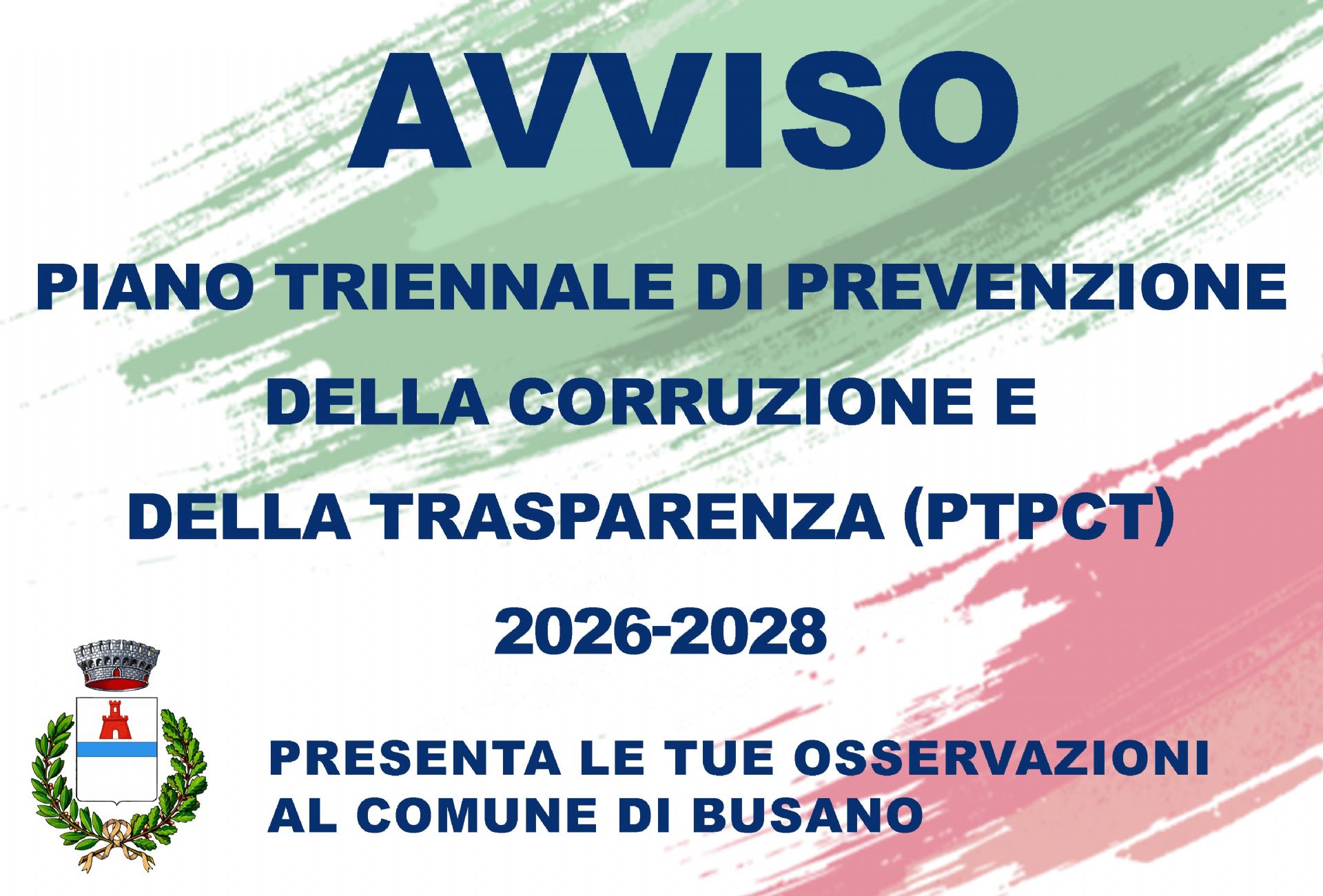 Questa Amministrazione, nell’ambito delle iniziative e delle attività condotte in materia di trasparenza e d’interventi per la prevenzione ed il contrasto della corruzione, deve approvare il Piano Triennale di Prevenzione della Corruzione e della Trasparenza (PTPCT) 2026-2028.