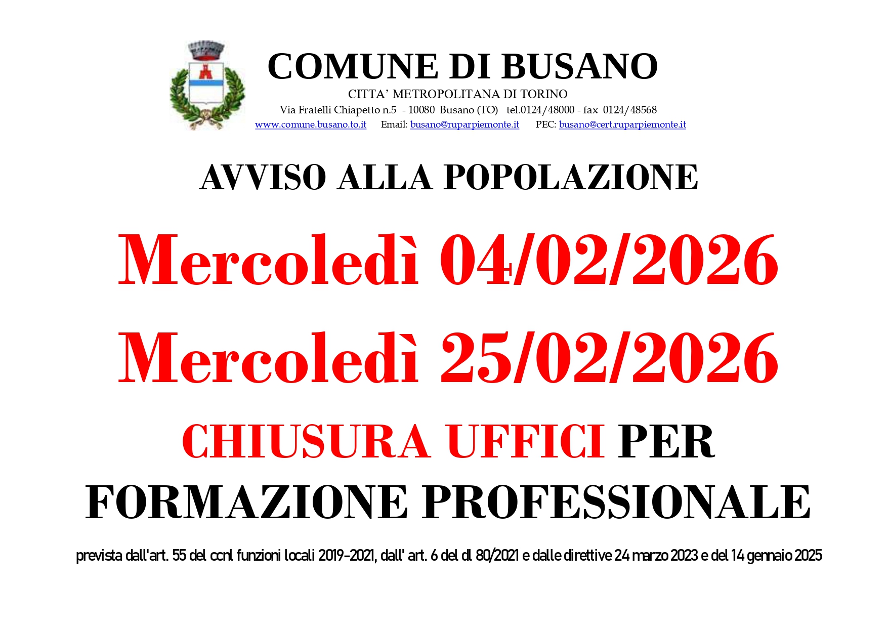 Si avvisa la popolazione che Mercoledì 4 febbraio 2026 e Mercoledì 25 febbraio 2026 gli Uffici Comunali saranno chiusi per formazione del personale.