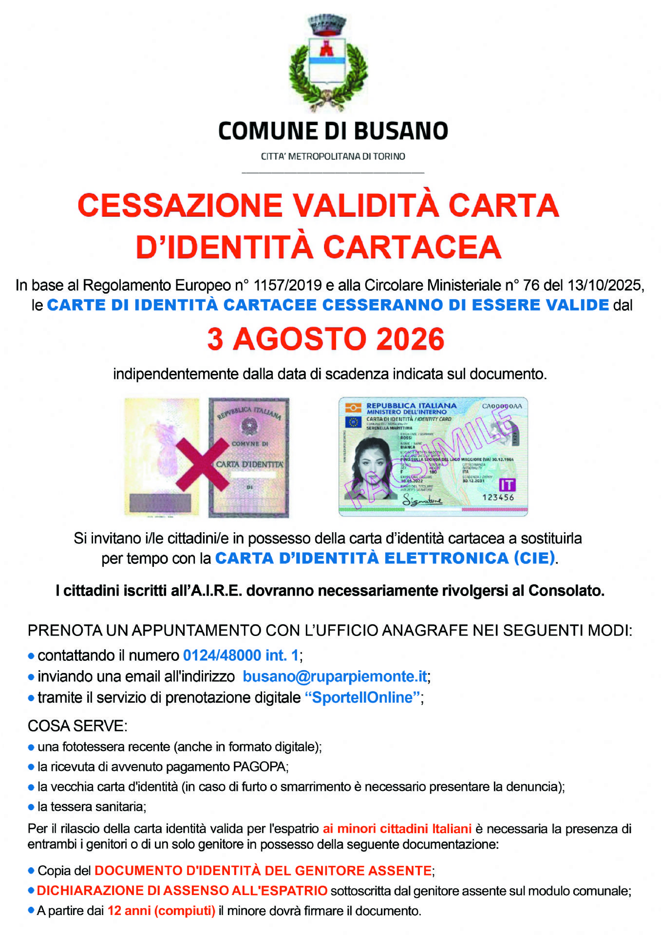 Si invitano i/le cittadini/e in possesso della carta d’identità cartacea a controllare la scadenza riportata: nel caso la scadenza fosse successiva al 3 agosto 2026, si invita gli stessi/e a contattare l’Ufficio Anagrafe per il rilascio della nuova carta di identità elettronica.