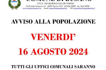 Venerdi’ 16 agosto 2024 tutti gli uffici comunali saranno chiusi al pubblico.