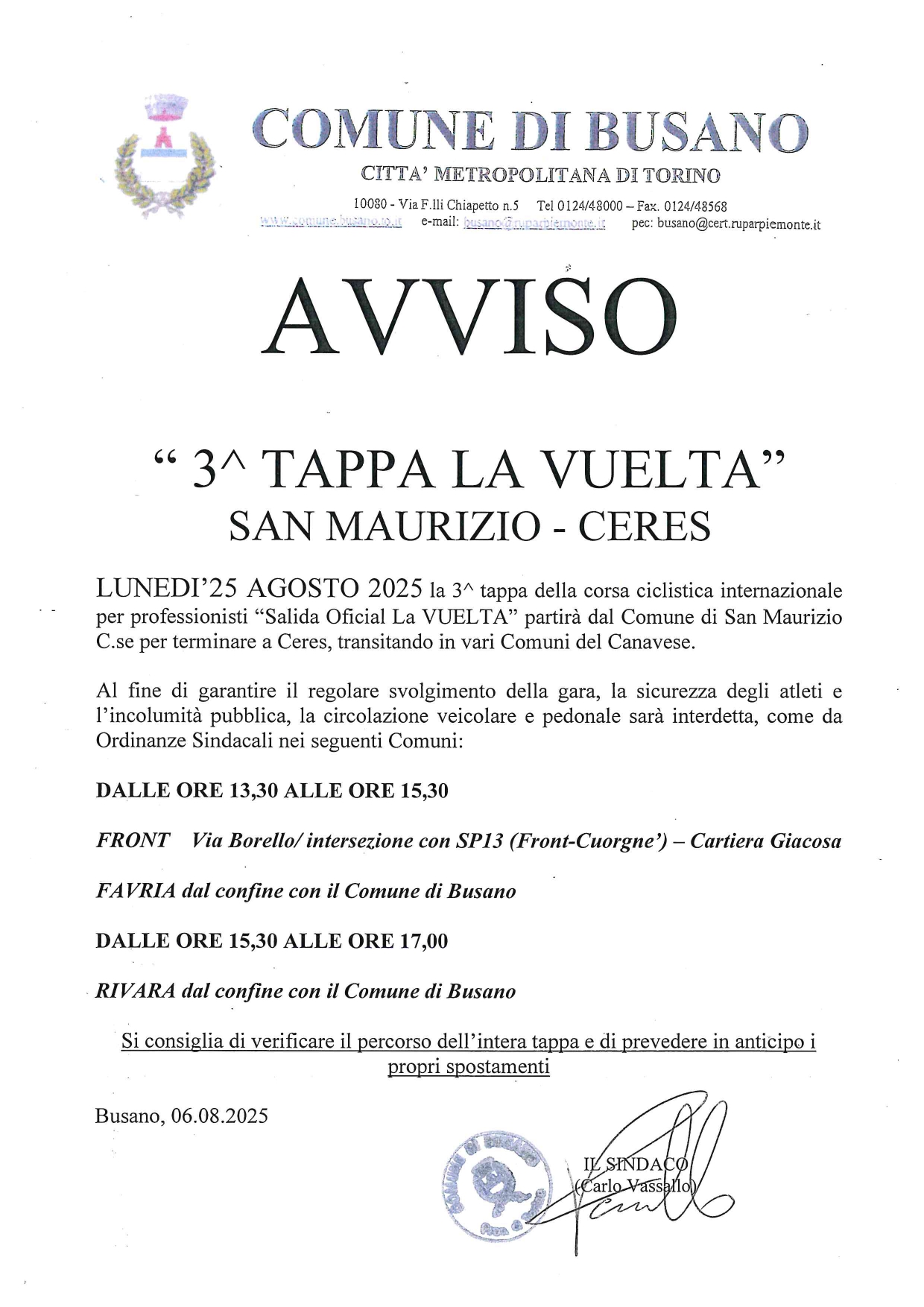 Si avvisa la popolazione che lunedì 25 agosto 2025 si terrà la 3^ tappa della corsa ciclistica internazionale per professionisti "Salida Oficial LA VUELTA" che partirà dal Comune di San Maurizio Canavese per terminare a Ceres, transitando in vari Comuni del Canavese.