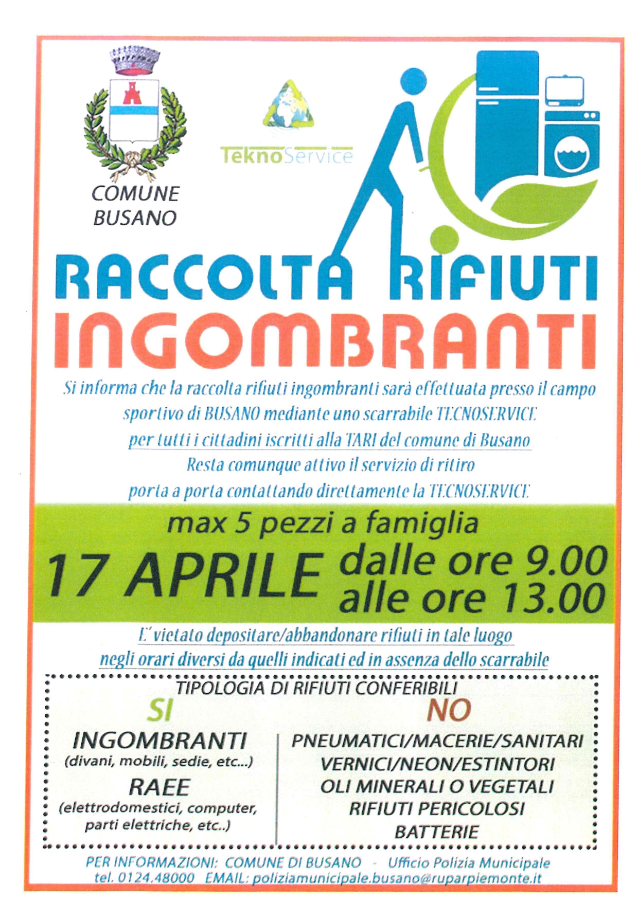 Si informa la popolazione che giovedì 17 aprile 2025 dalle ore 9.00 alle ore 13.00 sarà effettuata la raccolta rifiuti ingombranti presso il CAMPO SPORTIVO di BUSANO mediante uno scarrabile TEKNOSERVICE per tutti i cittadini iscritti alla TARI del Comune di Busano.